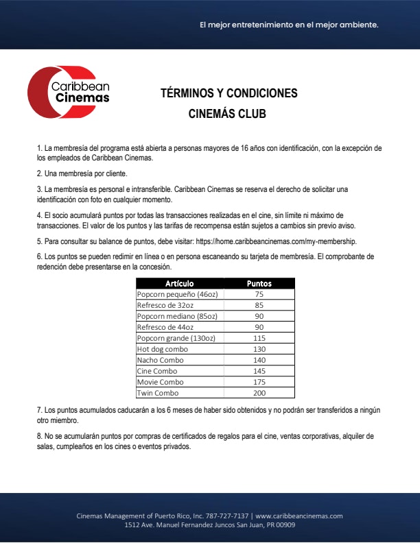 CinemásClub is completely free! It's our way to say thank you for spending your time at Caribbean Cinemas locations.